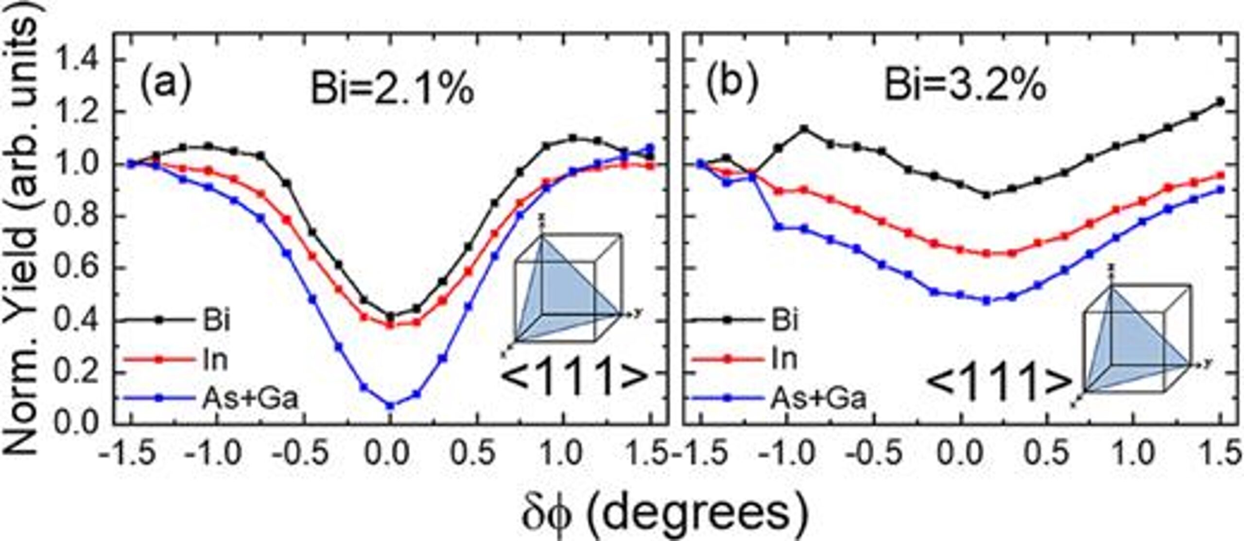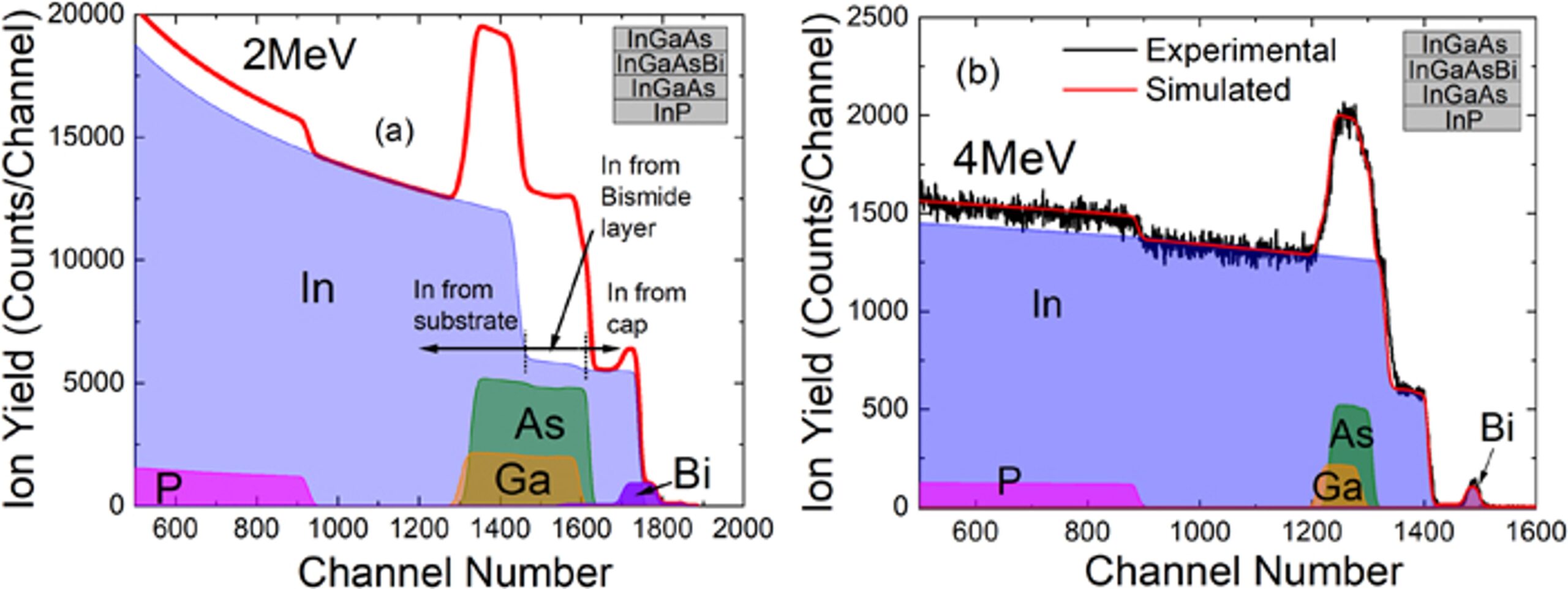 ☐ The work uses RBS channelling to investigate the crystallographic quality, defect structure, and damage (or implantation-induced changes) in a material (InGaAsBi/InP structures) following some processing or irradiation.